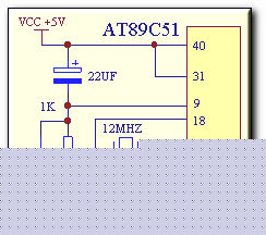 单片机的最小化系统是指单片机能正常工作所必须的外围元件,主要可以分成时钟电路和复位电路,我们采用的是AT89C51芯片,它内部自带4K的FLASH程序存储器,一般情况下,这4K的存储空间足够我们使用,所以我们将AT89C51芯片的第31脚固定接高电平(PCB画板时已经接死),所以我们只用芯片内部的4K程序存储器。单片机的时钟电路有一个12M的晶振和两个30P的小电容组成,它们决定了单片机的工作时间精度为1微秒。复位电路由22UF的电容和1K的电阻及IN4148二极管组成,以前教科书上常推荐用10UF电容和10K电阻组成复位电路,这里我们根据实际经验选用22UF的电容和1K的电阻,其好处是在满足单片机可靠复位的前提下降低了复位引脚的对地阻抗,可以显著增强单片机复位电路的抗干扰能力。二极管的作用是起快速泄放电容电量的功能,满足短时间多次复位都能成功。